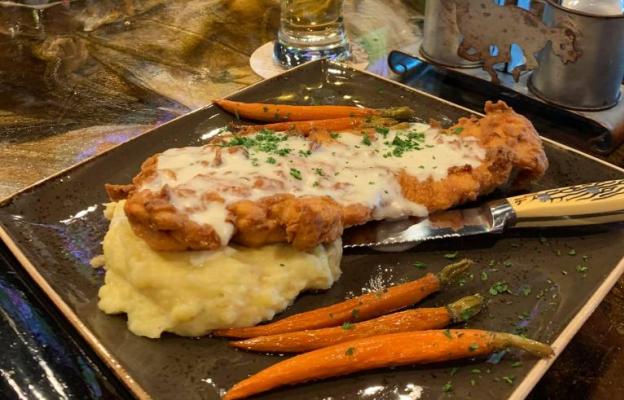 8oz breaded chicken breast | made-from-scratch white gravy | creamy mashed potatoes | honey glazed carrots