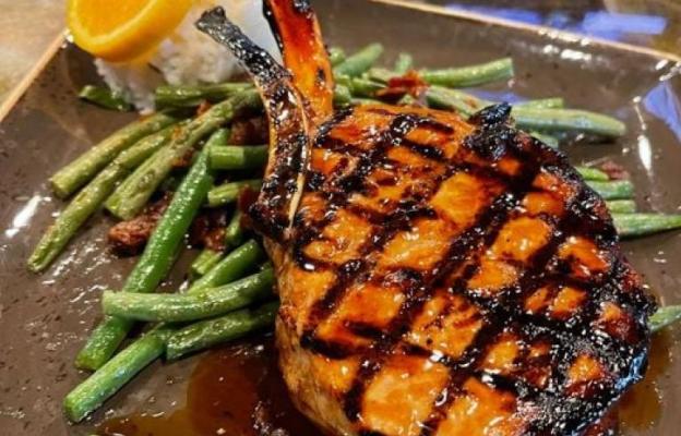 16oz double bone pork chop | brown sugar glaze house made teriyaki sauce | bed of cilantro lime white rice | fresh whole green beans | orange slice